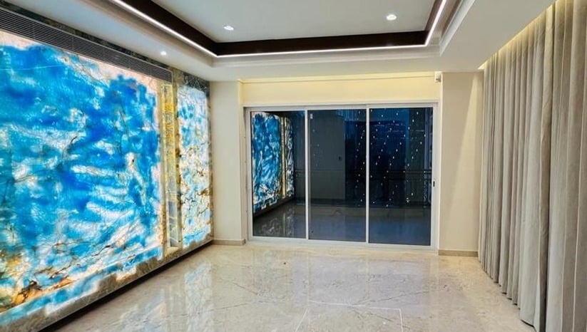 The highlight of the space is the striking blue onyx feature wall, illuminated to reveal its natural patterns and depth. This artistic element adds character and sophistication, transforming the room into a statement of elegance. The lighting design complements the stone beautifully, adding warmth without overpowering the space.