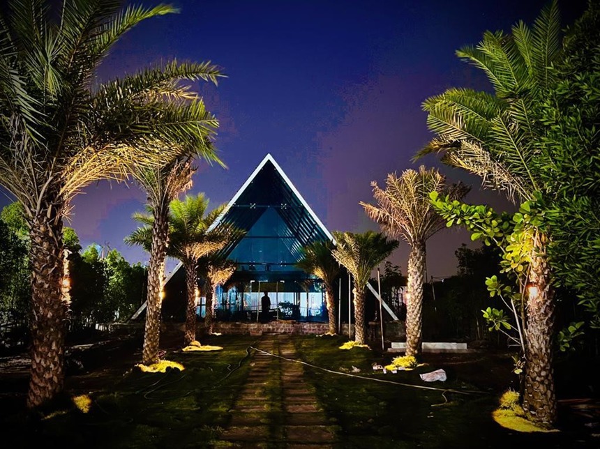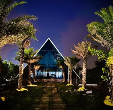 This architectural space is a seamless blend of modern design and natural surroundings. The triangular glass structure stands as a bold yet elegant centerpiece, reflecting contemporary aesthetics while maintaining a warm and inviting presence. Surrounded by lush greenery and palm trees, the design feels grounded in nature rather than separate from it.